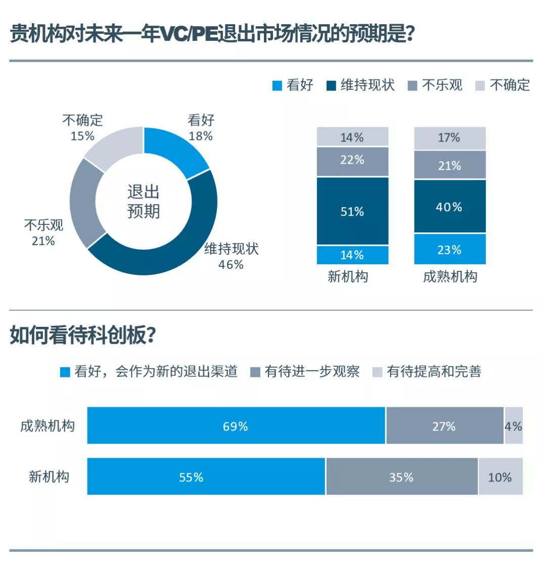 對2020年中國股權(quán)投資市場退出端“看好”和認(rèn)為“維持現(xiàn)狀”的機(jī)構(gòu)共占到所有調(diào)研的64%。其中,看好退出環(huán)境的成熟機(jī)構(gòu)多于新機(jī)構(gòu);與此同時,成熟機(jī)構(gòu)也更看好科創(chuàng)板,兩者具有一定相關(guān)性。反映出成熟機(jī)構(gòu)退出壓力加大,十分渴望國內(nèi)退出市場建設(shè)改革 。