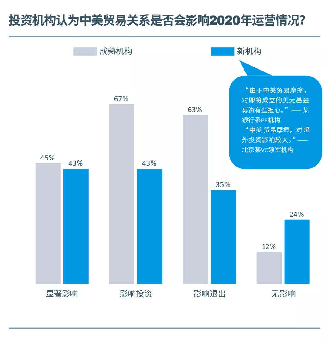 對于中美貿(mào)易關(guān)系對于2020年機(jī)構(gòu)運(yùn)營的影響,成熟投資機(jī)構(gòu)與新投資機(jī)構(gòu)的擔(dān)憂程度略有差異。成熟機(jī)構(gòu)對“貿(mào)易摩擦影響投資/退出”的擔(dān)憂更明顯,而新機(jī)構(gòu)認(rèn)為“無影響”的比例更大。