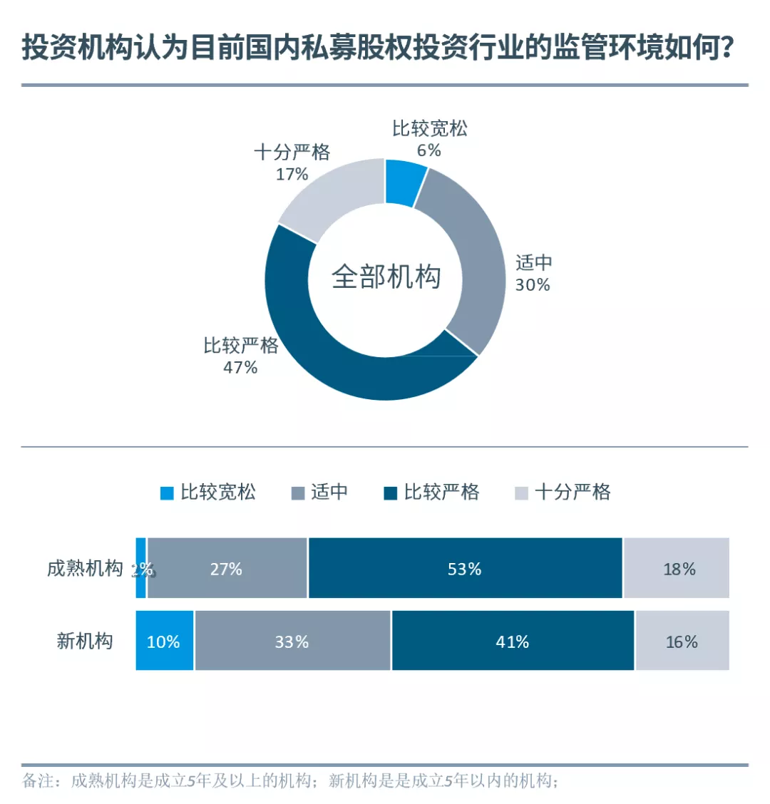 64%投資機(jī)構(gòu)認(rèn)為國內(nèi)當(dāng)前私募股權(quán)投資行業(yè)監(jiān)管嚴(yán)格(含“比較嚴(yán)格”和“十分嚴(yán)格”)。成熟機(jī)構(gòu)認(rèn)為“監(jiān)管嚴(yán)格”的比例遠(yuǎn)高于新機(jī)構(gòu),主要原因可能是2014年以來中國創(chuàng)新經(jīng)濟(jì)加速發(fā)展,市場層出不窮的模式和現(xiàn)象倒逼管理層加碼監(jiān)管,致使當(dāng)下的監(jiān)管環(huán)境與成熟機(jī)構(gòu)前期經(jīng)歷的“相對寬松”環(huán)境出現(xiàn)明顯反差。