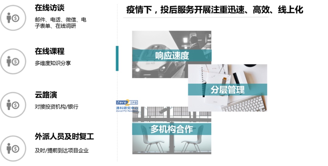 在嚴格的物理隔離之下,機構投后服務開展注重高效化、線上化。通過在線訪談、電子表單等形式收集被投企業(yè)信息;通過線上課程解答眾多創(chuàng)業(yè)企業(yè)需要面對的共性問題;原本線下進行的資源對接會、路演也轉為了“云路演”,為企業(yè)高效對接資源。針對有外派人員的并購類、工程類項目,外派人員及時甚至提前到崗,加快企業(yè)安全復工復產。