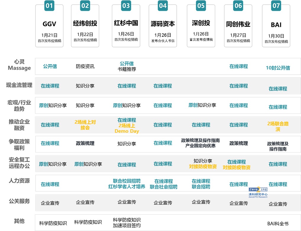 VC機構是投后服務體系較為健全的一類。面對突發(fā)狀況,VC機構投后服務啟動迅速,例如1月26日,紅杉中國即發(fā)布了《紅杉中國給成員企業(yè)的一封信》,發(fā)出對被投企業(yè)的三個提醒。紅杉、源碼資本、GGV等機構均迅速開展了系列課程,涵蓋遠程辦公協作、勞動法規(guī)培訓、疫情時期的融資策略、疫情期間的財務風險管理以及疫情時期的人力資源優(yōu)化等方面。紅杉、經緯、BAI率先嘗試了線上路演形式;紅杉、深創(chuàng)投、源碼資本幫助企業(yè)解決春招難題。