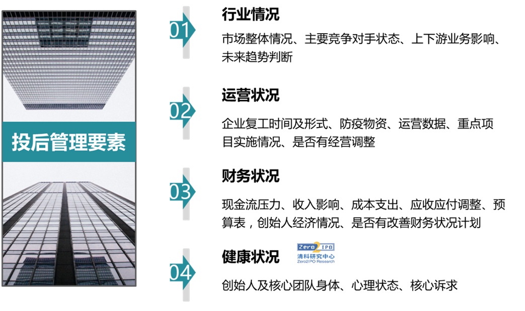全球性黑天鵝事件爆發(fā),企業(yè)經營管理和抗風險能力正面臨極大考驗,機構在這一特殊時期,需要持續(xù)對被投企業(yè)運營狀況、財務狀況進行跟蹤。了解企業(yè)復工安排、重點項目進展情況、關懷創(chuàng)始人的身心健康,隨時關注和掌握被投企業(yè)的痛點和訴求。同時,根據企業(yè)反饋情況和數據,重新評估被投企業(yè),出具風險提示文件、制定風險控制策略。在企業(yè)面臨困境時,高頻跟蹤和深入溝通是投資機構及時解決企業(yè)困難、把控項目風險的最佳方案。