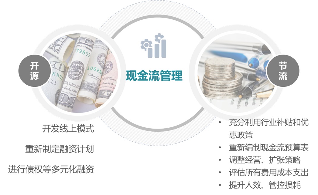疫情之下,企業(yè)現金流出現危機,“開源節(jié)流”、“留足12個月運營資金”的呼聲不絕于耳。“開源”方面,鼓勵企業(yè)跳出原有運營模式,評估打造線上產品的可能性,同時重新制定融資計劃,全面了解“股權”和“債權”融資方式,調整估值預期。“節(jié)流”方面,充分利用行業(yè)補貼和優(yōu)惠政策,例如延遲繳納社保等,及時調整經營策略,降低擴張速度和補貼力度,編制未來一年現金流預期表,及時處理應收應付,評估銷售、薪酬、房租等費用項目,制定合理降本計劃。
