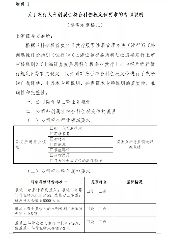 在《暫行規定》中,“關于發行人科創屬性符合科創板定位要求的專項說明”、“關于發行人科創屬性符合科創板定位要求的專項意見”兩個附件格外引人注意。在提供“考卷”的大綱之外,上交所還貼心地附上了標準答案作為參考示范。